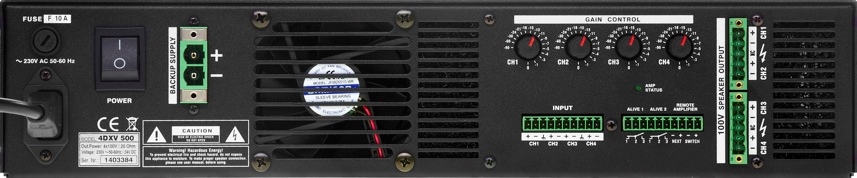 4-Kanal Klass D Leistungsverstärker mit 24 Volt Notstromversorgung, Störmeldeausgang, Einschaltstrombegrenzung und Softstart, sowie zwei eingebaute Lüfter mit temperaturgesteuerter Drehzahlregelung, integrierte elektronische Schutzschaltung gegen thermische Überlastung, DC Signale, subfrequente Signale, Kurzschluss, offene Ausgänge und HF-Einstrahlung Getrennt rastende Pegelsteller für EingangsVerstärker pro Kanal Getrennte LED-Statusanzeige pro Kanal für CLIP,