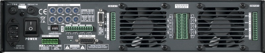 Leistungsverstärker mit acht unabhängigen niederohmigen Verstärkerkanälen, Einschaltstrombegrenzung und Softstart, eingebaute Lüfter mit temperaturgesteuerter Drehzahlregelung, integrierte elektronische Schutzschaltung gegen thermische Überlastung, DC Signale, subfrequente Signale, Kurzschluss, offene Ausgänge und HF-Einstrahlung, getrennt rastende Pegelsteller für EingangsVerstärker pro Kanal Getrennte LED-Statusanzeige pro Kanal für CLIP,
