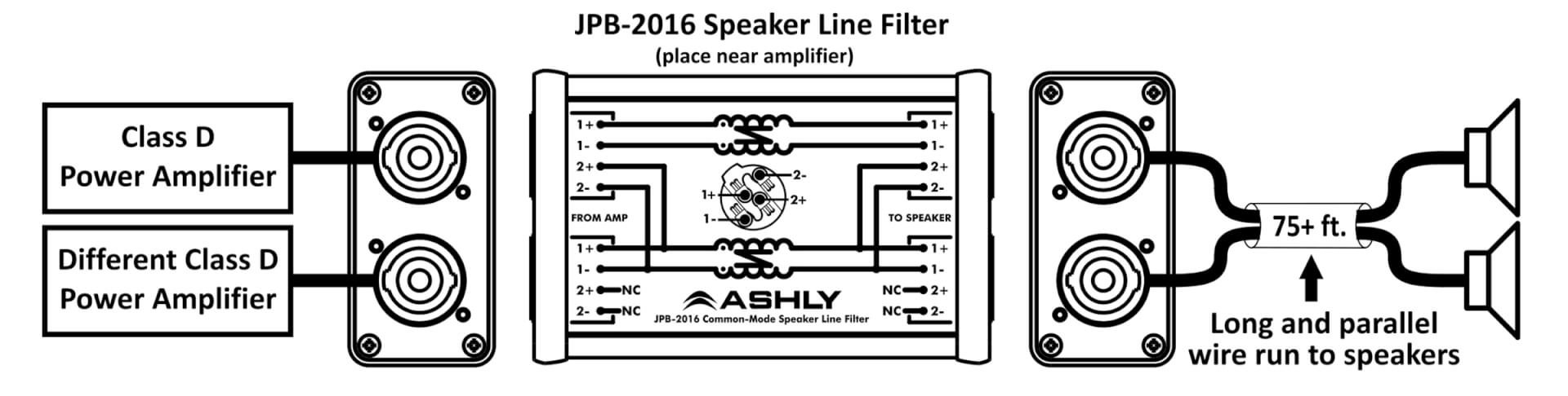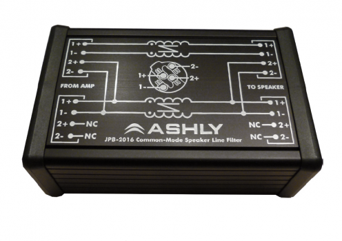 The Common Mode Speaker Line Filter (JPB-2016) is used to eliminate undesirable heterodyne tones caused by capacitive coupling of multiple Class D power amplifier outputs. Heterodyning is the combination of two or more frequencies to create sum and difference tones, in this case within the audible range. Heterodyne tones can occur when output cables from more than one Class D amplifier are run close together over a long distance, even with no audio signal present. Ashly Class-D amplifiers currently include all nX, NE two-channel, NE multi-channel, Pema, SRA, and TRA models. The JPB-2016 is wired using Neutrik® speak-ON NL-2 or NL-4 type connectors.