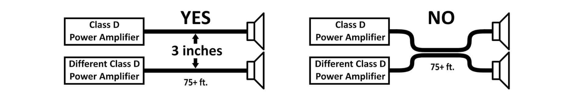 Another simple technique when routing long speaker lines from separate Class-D amplifiers is to leave some physical distance (2″ to 3″ minimum) between each bundle run that is tied to each separate amplifier as shown below.